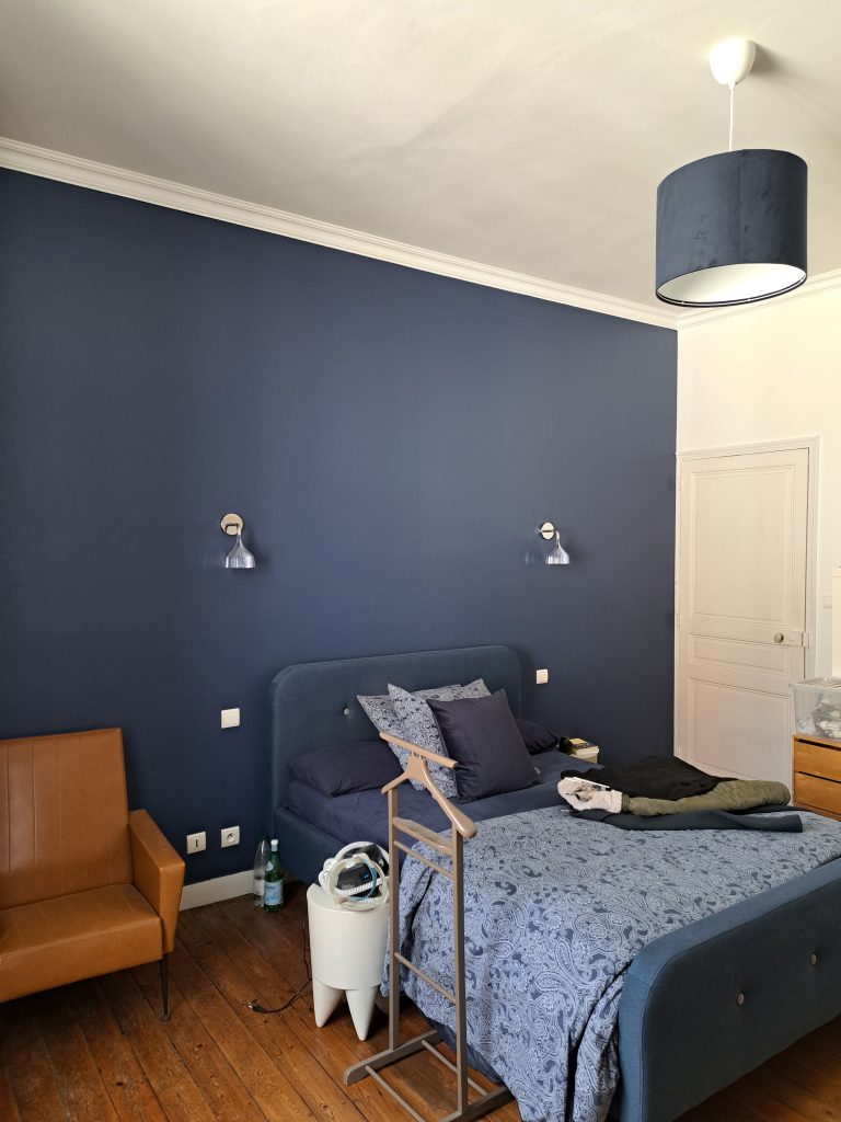Un beau mur bleu pour une tête de lit.